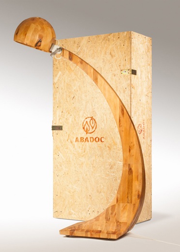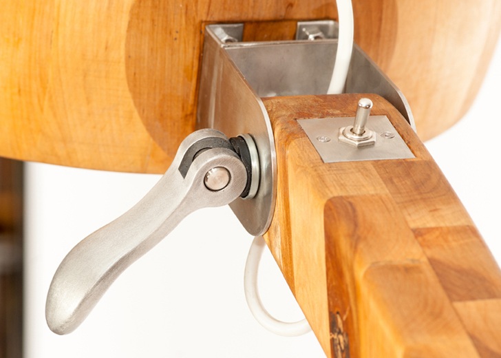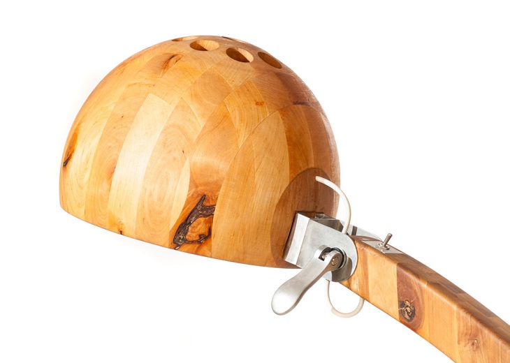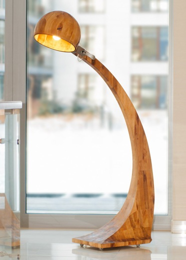 Zrobiona z drewna i stali nierdzewnej, powstała w oparciu o inspirację łukiem – kształtem o wyjątkowej symbolice i cechach, które pozwoliły na uzyskanie unikatowej stylistyki. Jej smukły korpus jest ręcznie modelowany z klejonego kloca drewna. Podobnie jest z jej dużym kloszem, który korzystając ze specjalnego przegubu i dźwigni zaciskowej można dowolnie ustawić, kierując światło w wybranym kierunku. Daje się swobodnie przemieszczać, dzięki zamontowanym w korpusie kółkom.